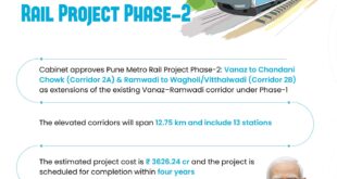 नई दिल्ली : प्रधानमंत्री नरेन्द्र मोदी की अध्यक्षता में केंद्रीय मंत्रिमंडल ने बुधवार को पुणे मेट्रो रेल परियोजना के दूसरे चरण के लिए 3,626.24 करोड़ रुपये मंजूर किए। इस चरण के अंतर्गत दो नए एलिवेटेड कॉरिडोर वनाज़ से चांदनी चौक …