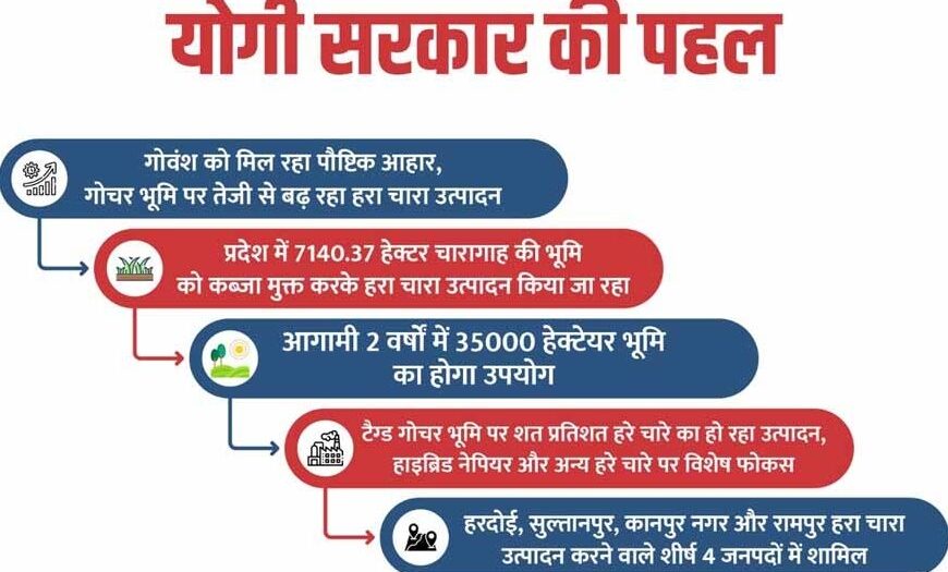 प्रदेश के हरदोई, सुल्तानपुर, कानपुर नगर और रामपुर जनपदों में हरा चारा उत्पादन में उल्लेखनीय वृद्धि दर्ज की गई है। वहीं टैग्ड गोचर भूमि पर शत-प्रतिशत हरा चारा उत्पादन सुनिश्चित किया जा रहा है। गोचर एवं चारागाह भूमि का समतलीकरण, सुरक्षाबाड़ा एवं खाई निर्माण जैसे कार्य मनरेगा कन्वर्जेन्स के माध्यम से कराए जा रहे हैं, जिससे ग्रामीणों को रोजगार भी मिल रहा है और पशुओं के लिए सुरक्षित चारागाह भी विकसित हो रहे हैं।