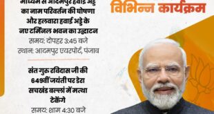 नई दिल्ली : प्रधानमंत्री नरेन्द्र मोदी आज पंजाब का दौरा करेंगे। प्रधानमंत्री दोपहर लगभग 3:45 बजे आदमपुर हवाई अड्डा पहुंचेंगे। वो वहां हवाई अड्डे का नाम बदलकर ‘श्री गुरु रविदास जी हवाई अड्डा आदमपुर’ रखने की घोषणा करेंगे। प्रधानमंत्री पंजाब …